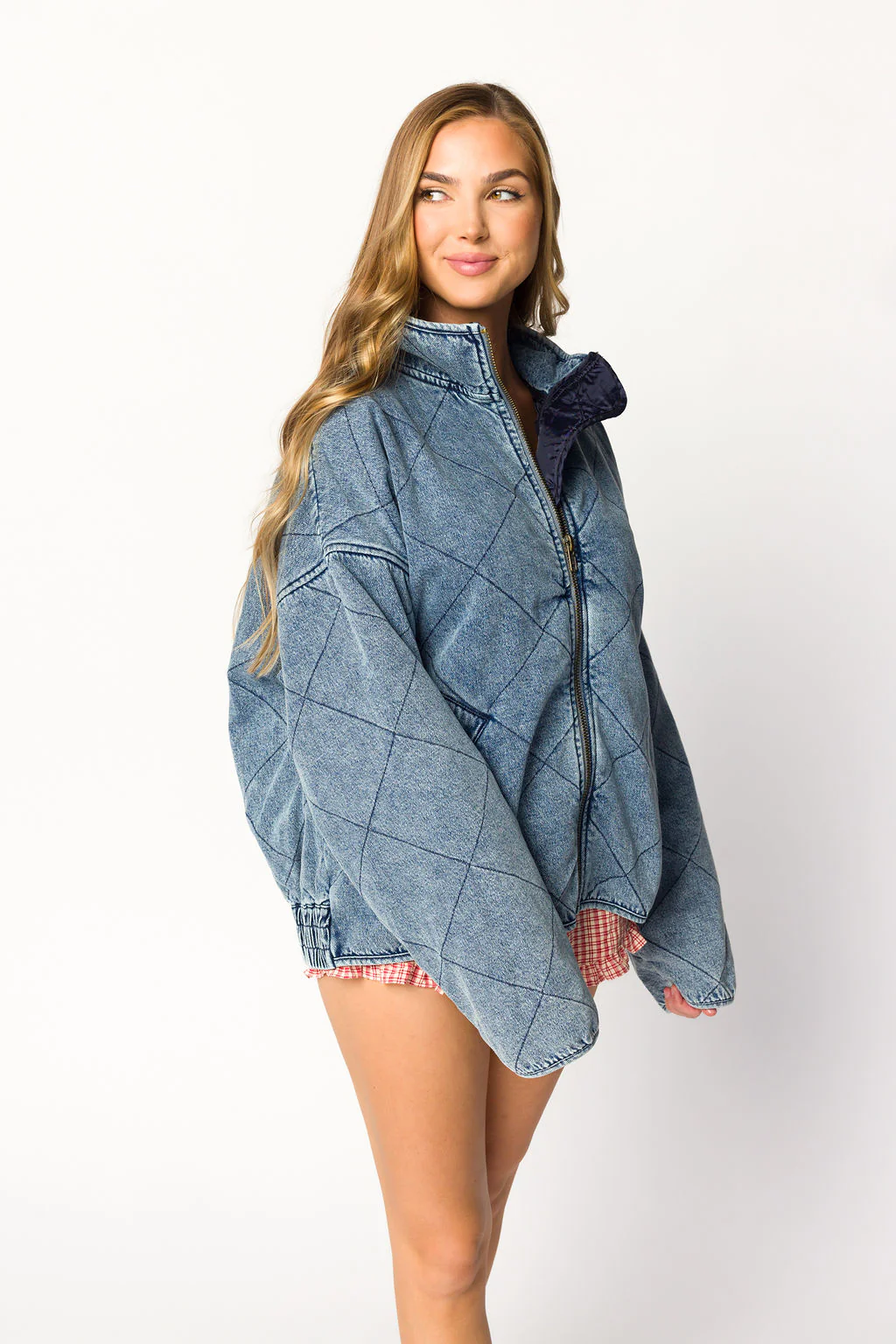 Lucille Boucle Plaid Puff Sleeve Jacket in Navy/Taupe
