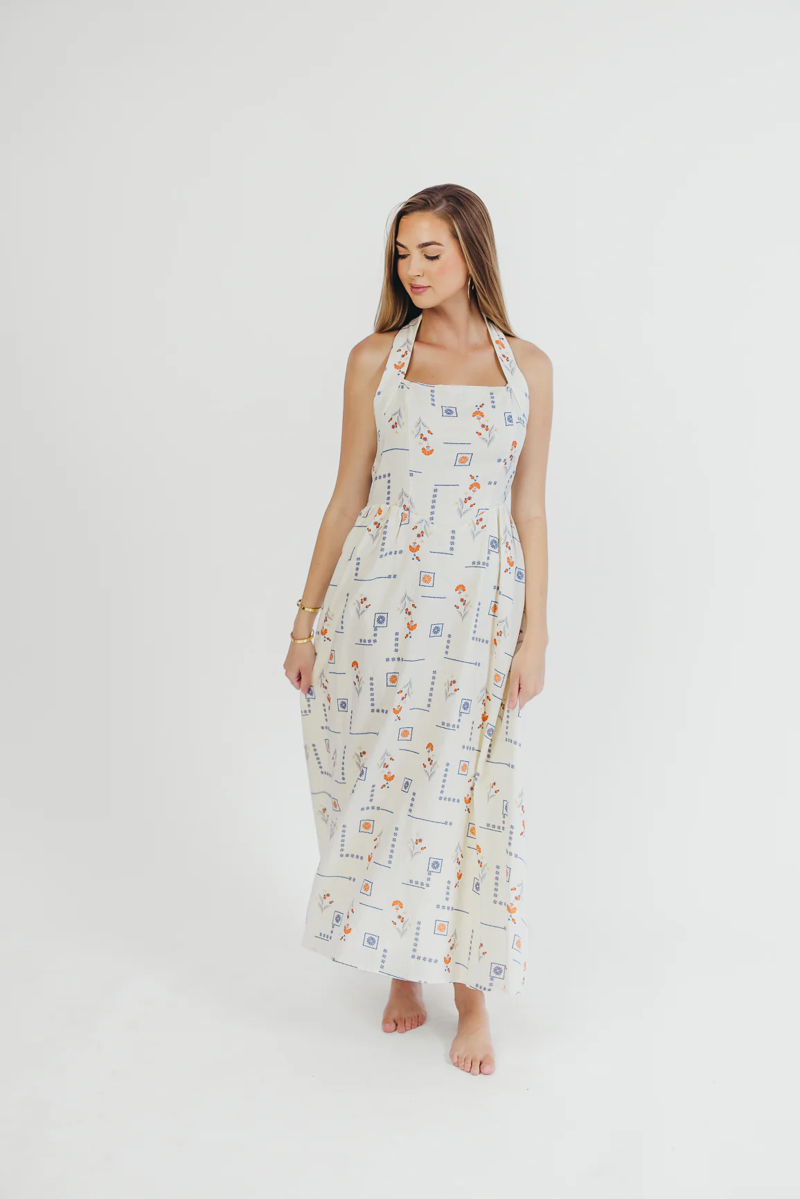 Athens Halter Midi Dress in White/Blue/Orange