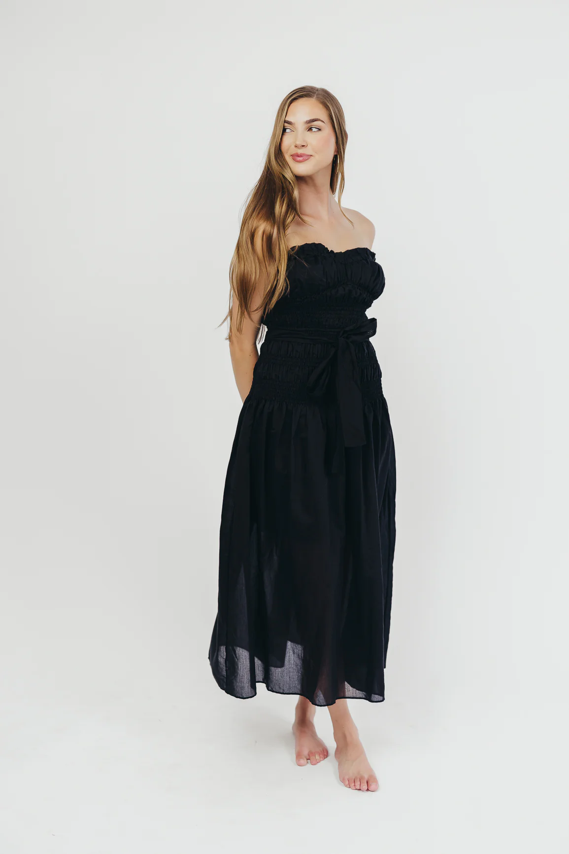 Devin Strapless Midi Dress with Sash in Black